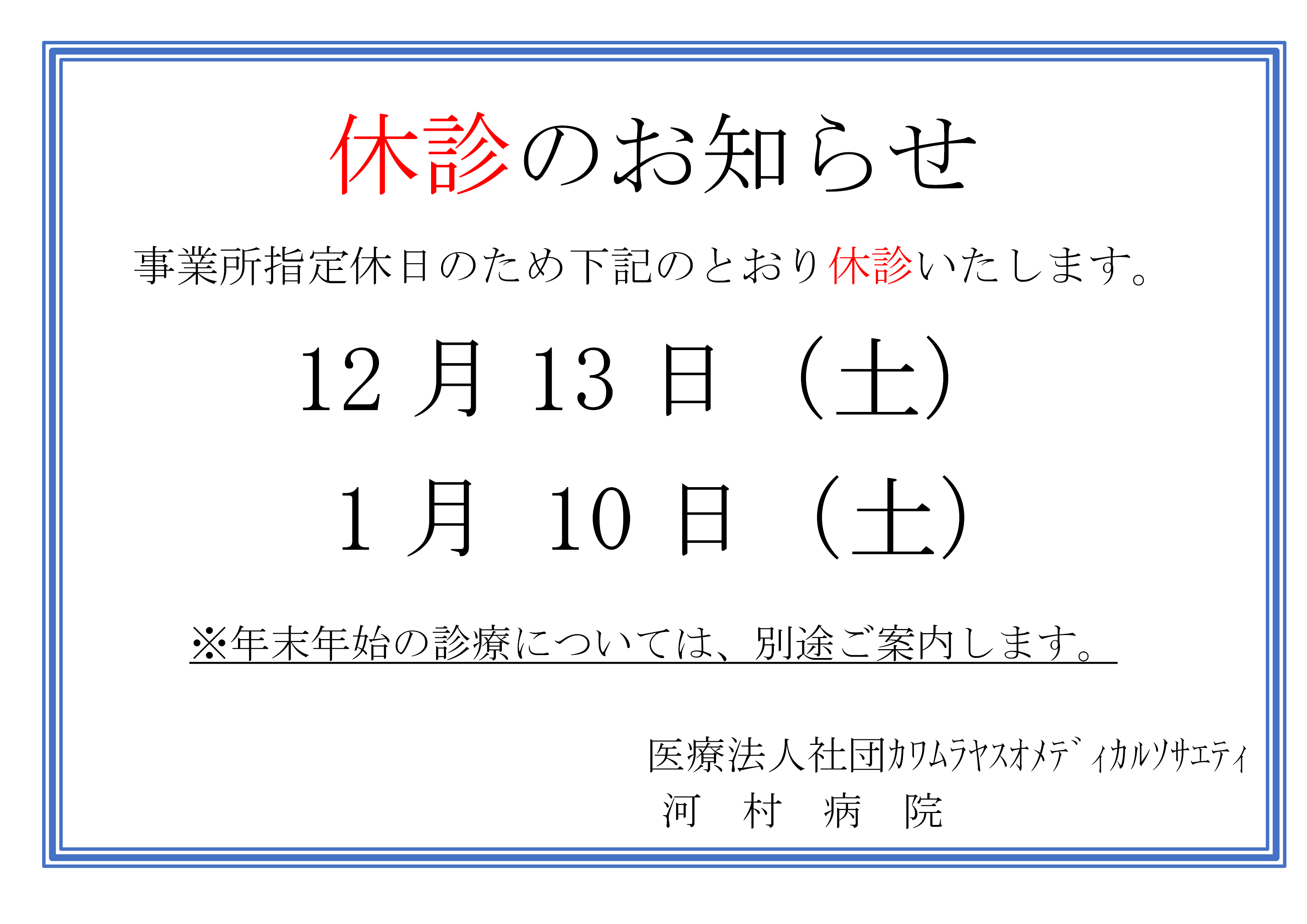 令和7年12月・令和8年1月 指定休診日のお知らせ